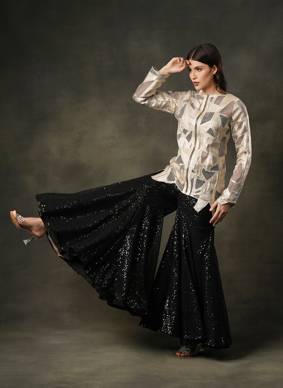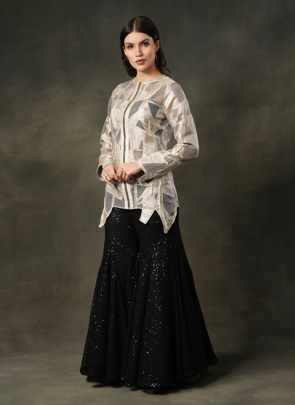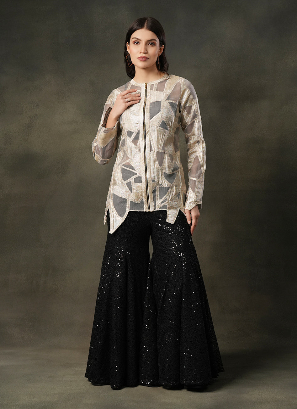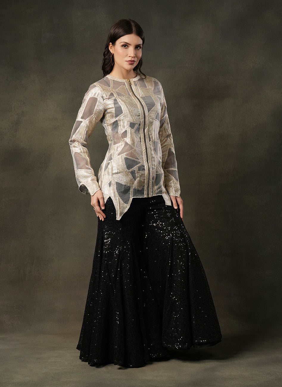 This statement jacket is tailored in a sheer organza base with bold geometric embroidery in metallic tones, finished with a front zipper for a sleek, structured look. Paired with voluminous black sequin sharara pants.