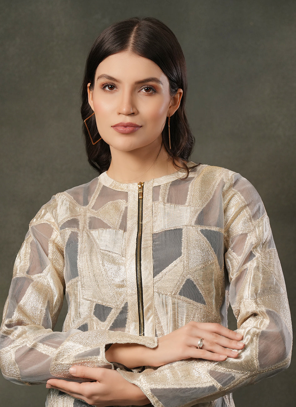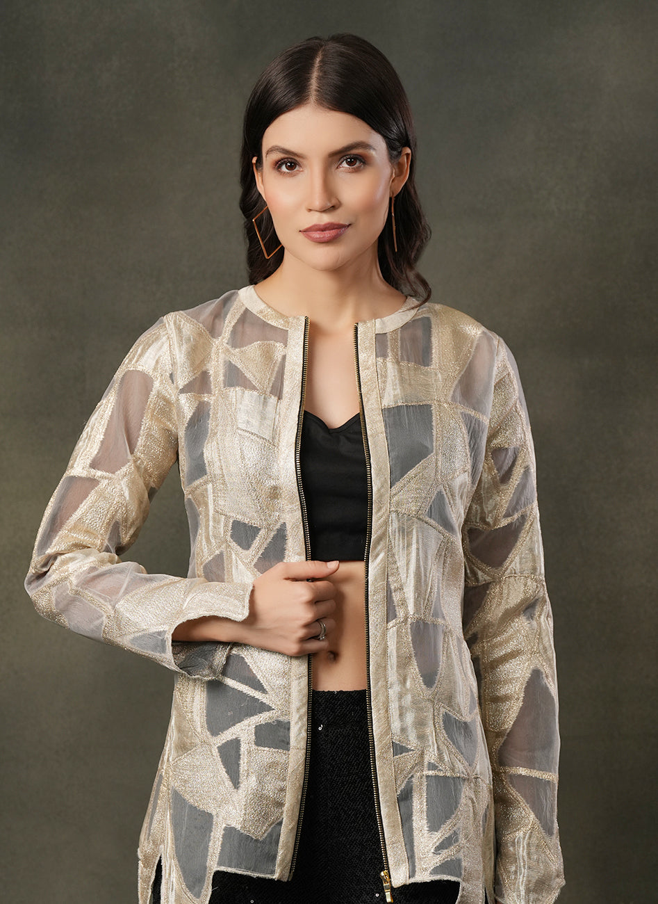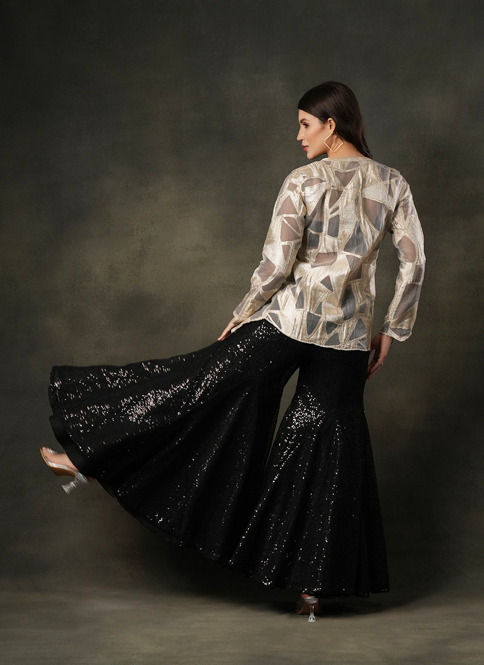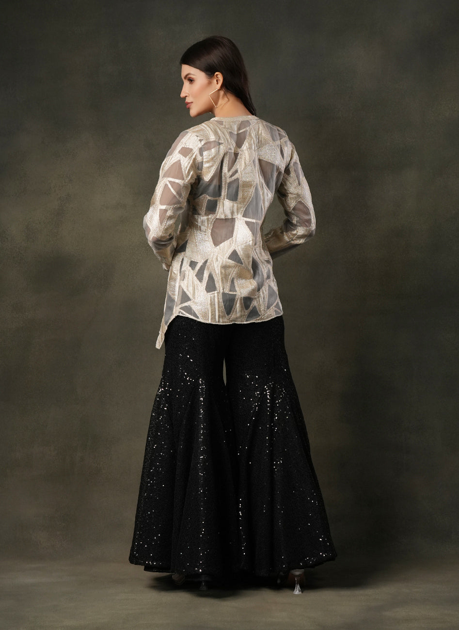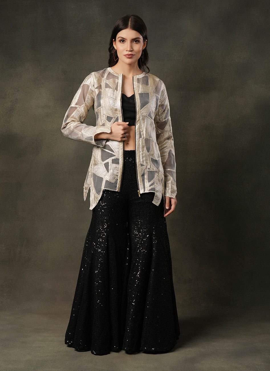 This statement jacket is tailored in a sheer organza base with bold geometric embroidery in metallic tones, finished with a front zipper for a sleek, structured look. Paired with voluminous black sequin sharara pants.