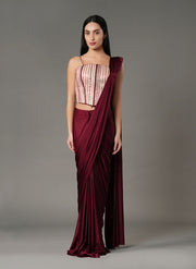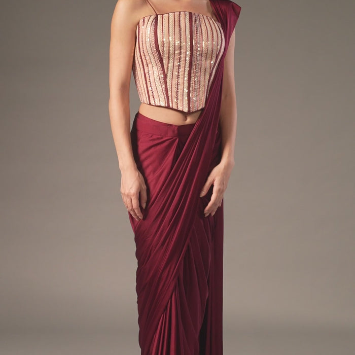 This effortlessly stylish maroon pre-draped saree is tailored in fluid fabric for a flattering fall, while the corset-style blouse is beautifully adorned with vertical sequin and bead hand embroidery, creating a striking silhouette.