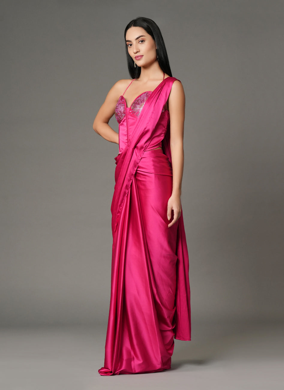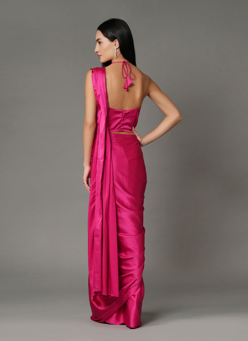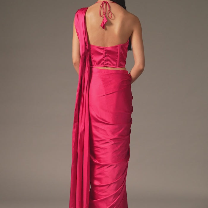 This bright Pink pre-drape saree is crafted in soft satin sculpted corset blouse featuring detailed glitter work and halter neck that gives effortlessly grace.