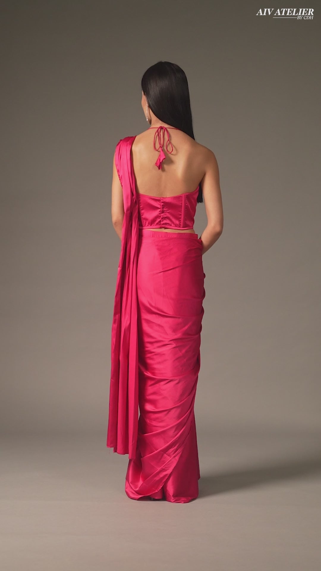 This bright Pink pre-drape saree is crafted in soft satin sculpted corset blouse featuring detailed glitter work and halter neck that gives effortlessly grace.