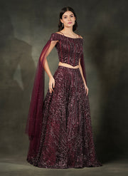 This corset-style blouse features off-shoulder straps and beaded tassel detailing paired with intricate sequin and thread embroided lehenga.