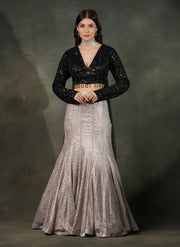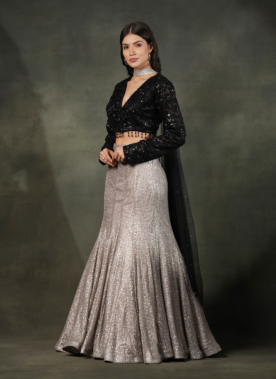 This ensemble features a flowing mesh sequin fish cut skirt with soft lining. A deep V-neck hand embroidered self to self nalki(tube bead) work top,with beaded tassels at the hem of the blouse and a shimmer mesh dupatta