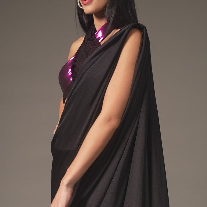 This chique fusion draped saree features a metallic finish pink bustier with halter neck paired with a black satin pre-draped saree.