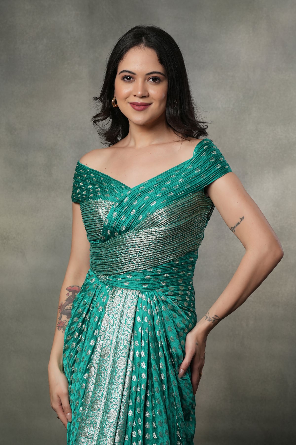 This banarsi silk off shoulder neckline with ruched crossover detailing, pre-draped gown with regal midnight blue and antique gold motifs, twisted front drape flowing into soft pleats