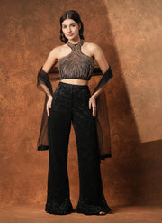 This set features a hand embroidered halter neck blouse with multi tonal sequins and beads featuring a sculpted neckline, paired with a high-waisted sequin embroidered fabric straight-cut trousers and a sheer black net dupatta