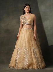 This stunning blend of geometry and grace, this set features a sleek V-neck blouse with metallic leaf embossing paired with a flowy skirt adorned in structured chevron and leaf dori motifs. A soft tulle dupatta with coordinated choker to complete the look