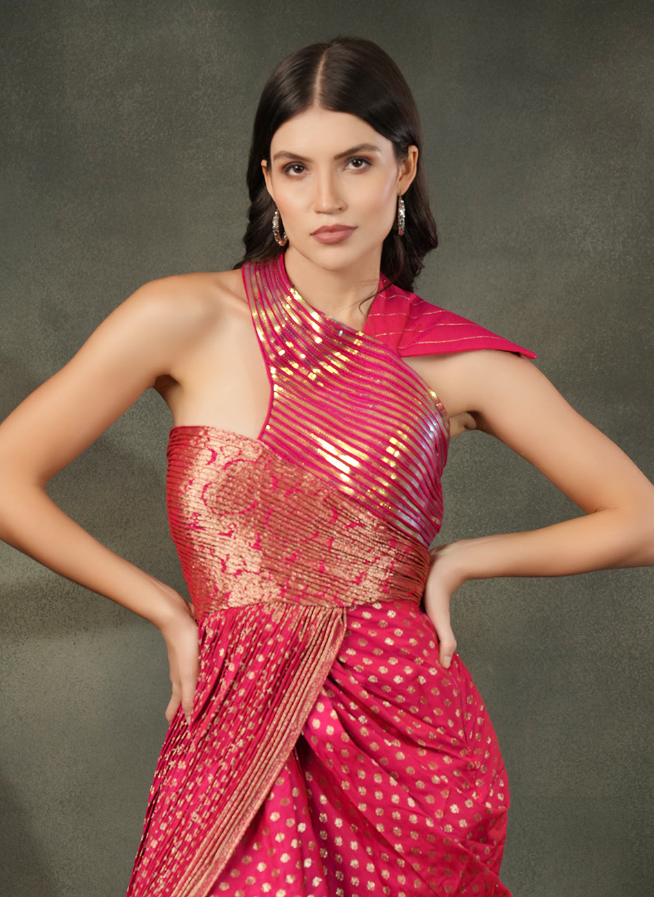 This striking Rani Pink pre draped dress crafted in rich woven Banarsi silk with gold motifs featuring a thigh-high slit, paired with one shoulder blouse which is sculpted with detailing and pleats