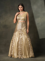 This radiant metallic gold lehnga features hand embroidered vertical leaf dori motifs and intricate sequin detailing, a draped blouse with modern neckline, structured waistline and a soft net dupatta