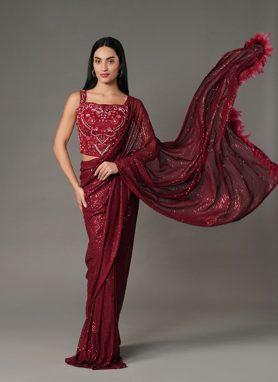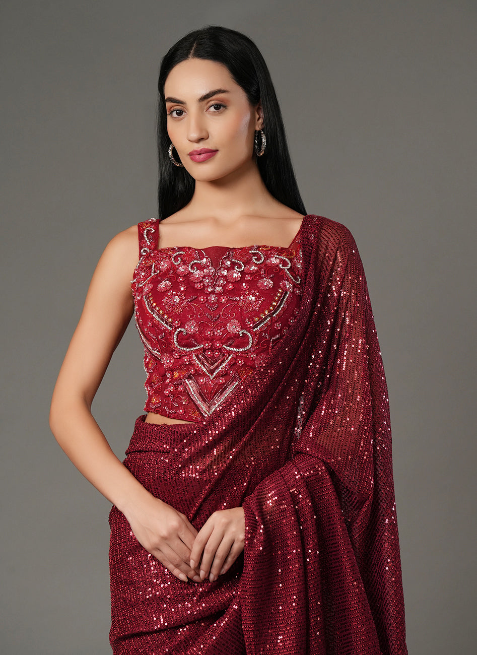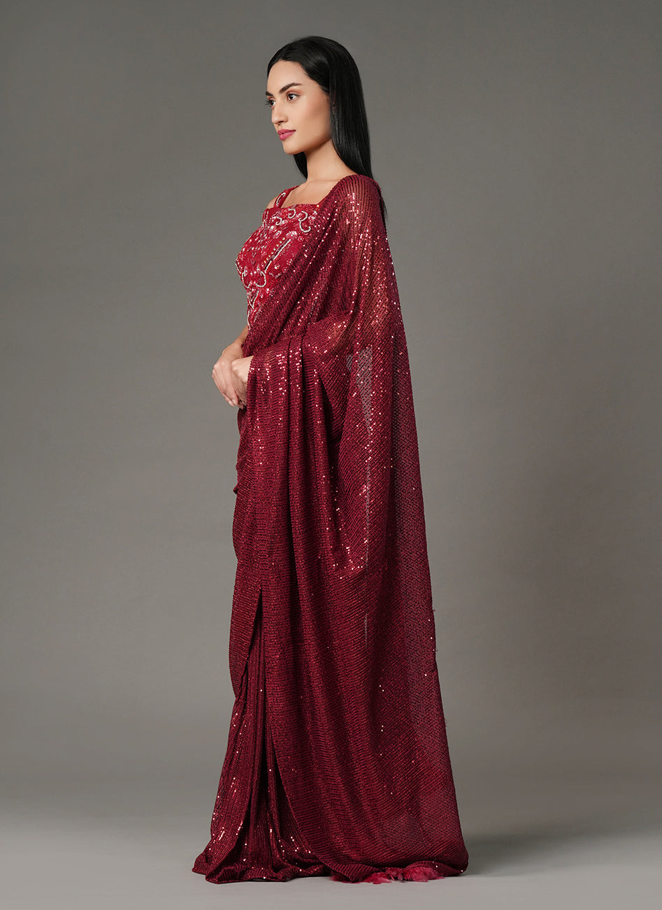 This stunning Deep red drape is adorned with glimmering sequins and elegant threadwork. The blouse features ornate hand embroidery with delicate detailing
