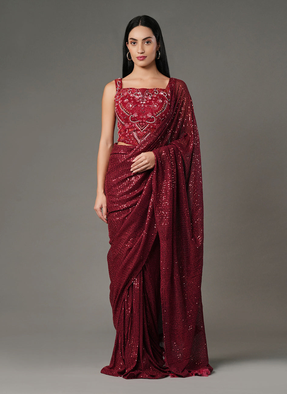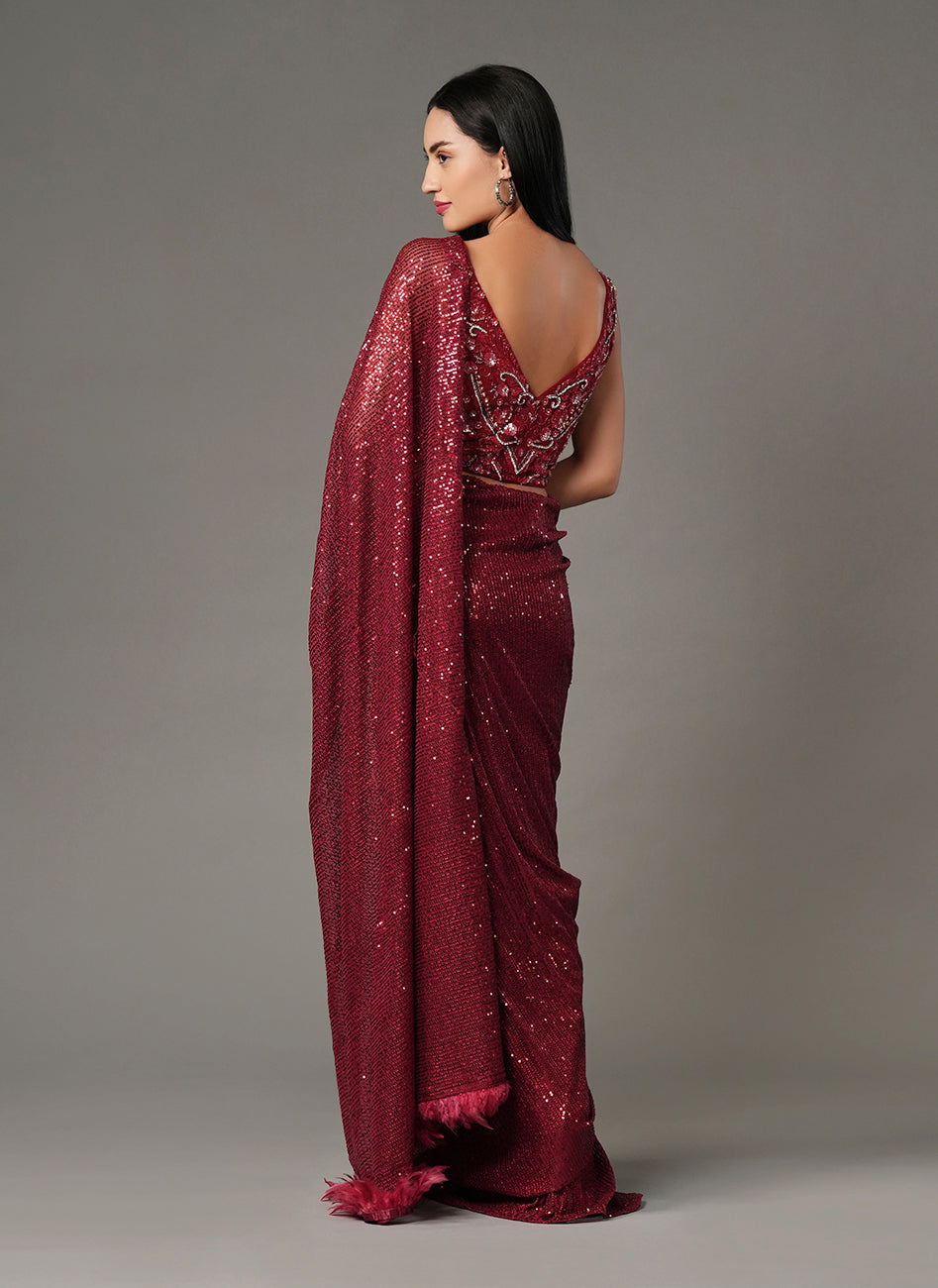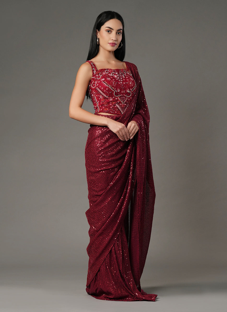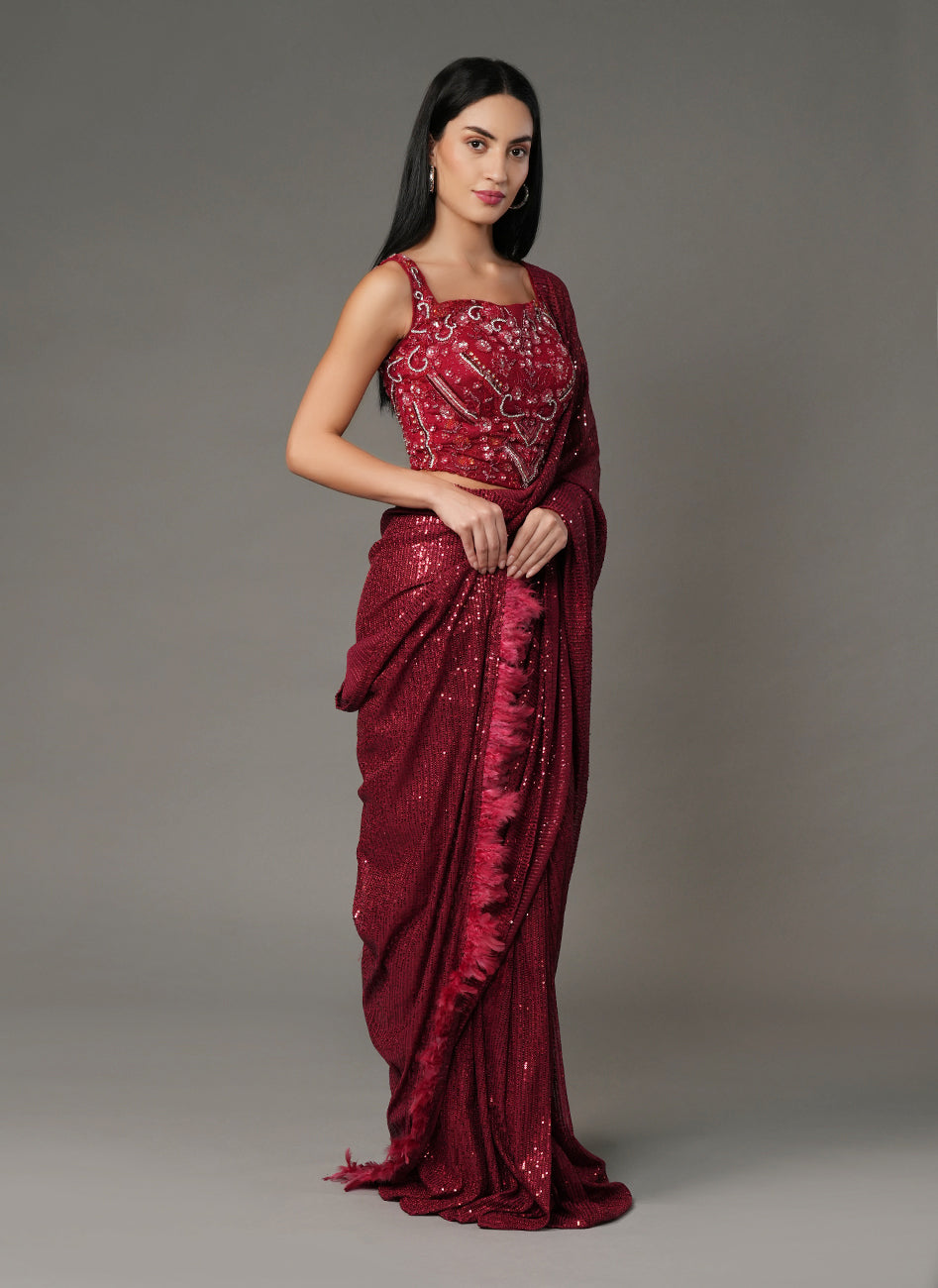 This stunning Deep red drape is adorned with glimmering sequins and elegant threadwork. The blouse features ornate hand embroidery with delicate detailing