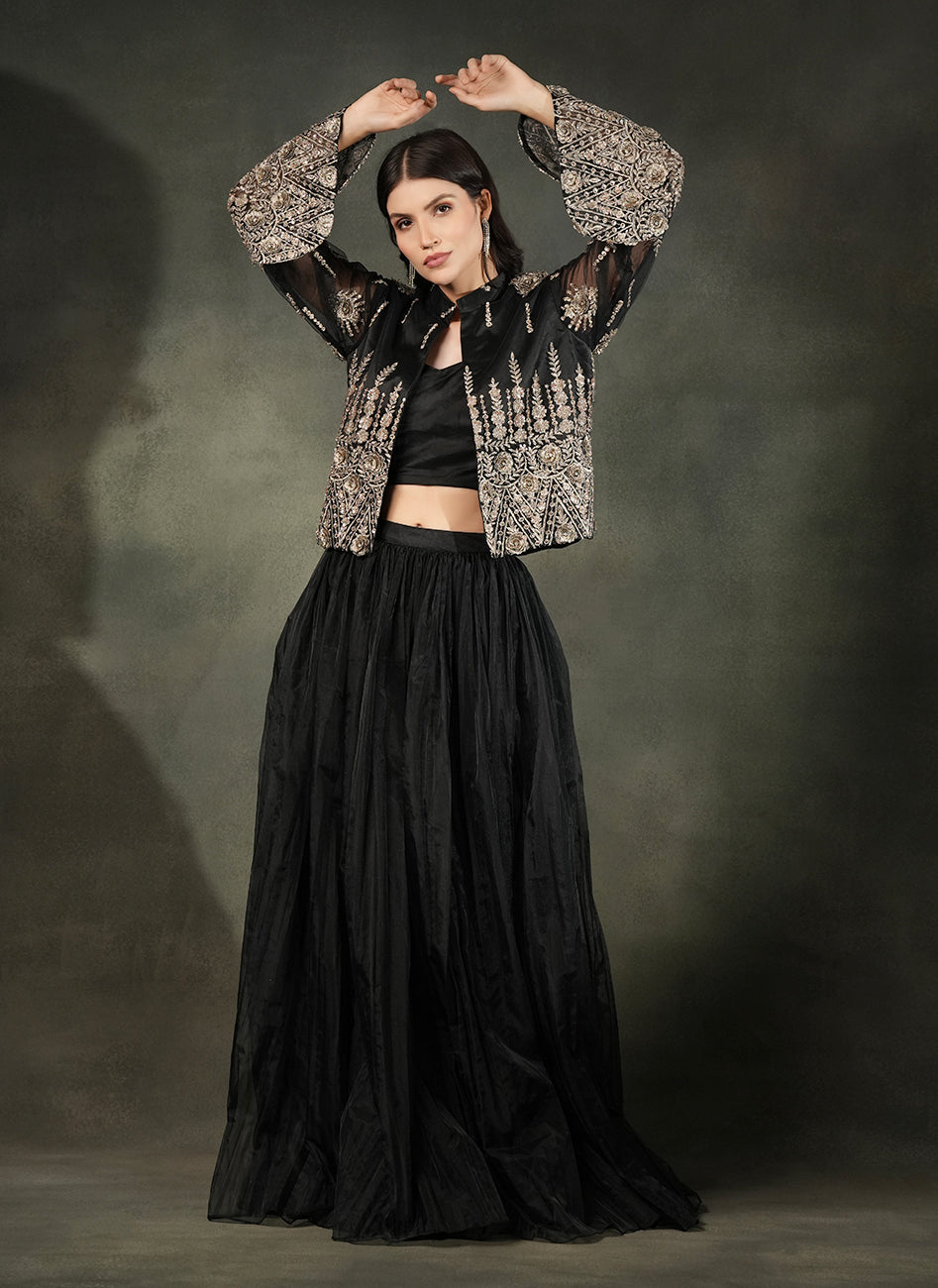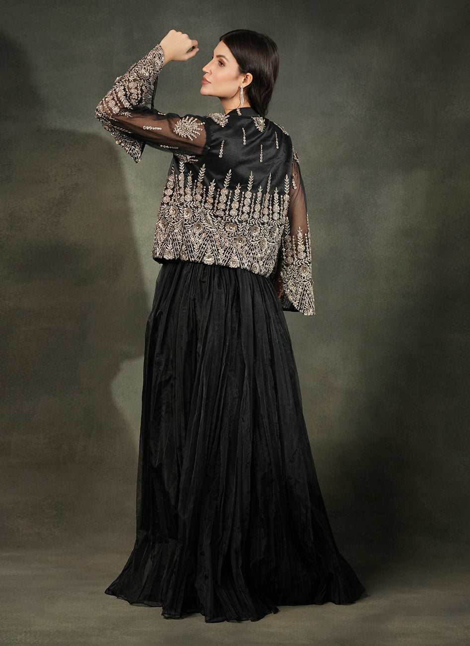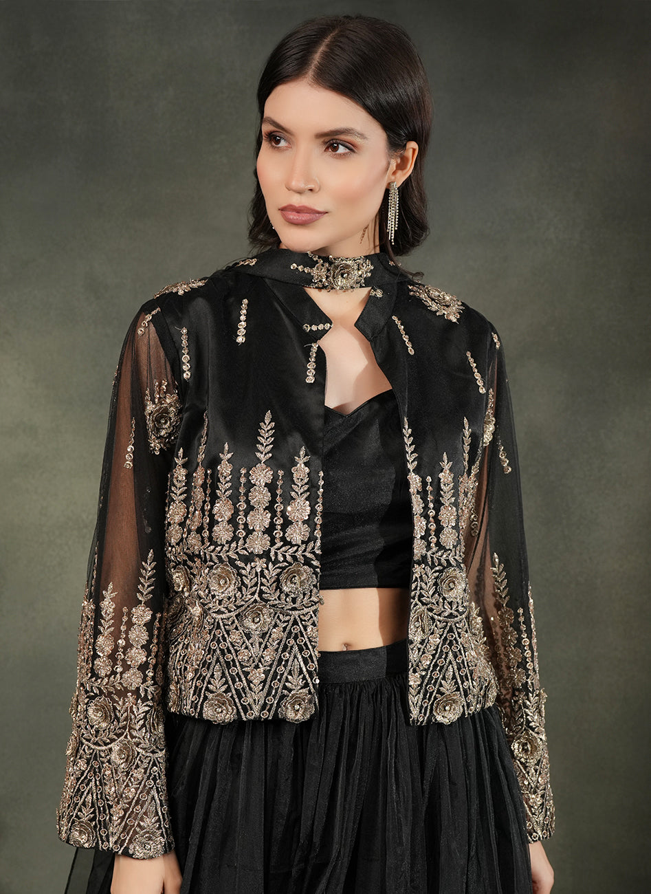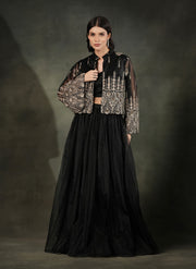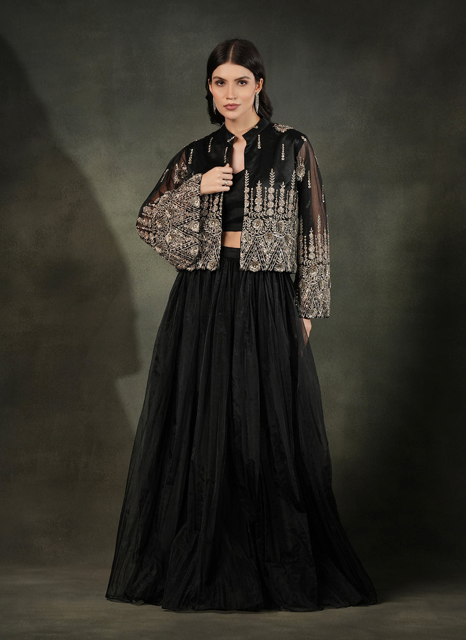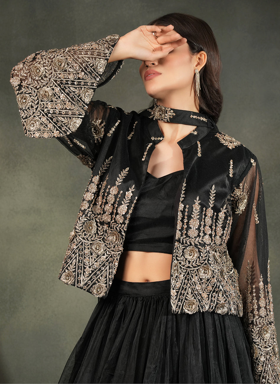 This dramatic all-black lehnga set features a voluminious tulle lehnga in soft organza paired with a sleek bustier blouse, elevated with a stunning sheer embroided net jacket with delicate metallic threadwork