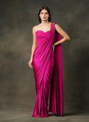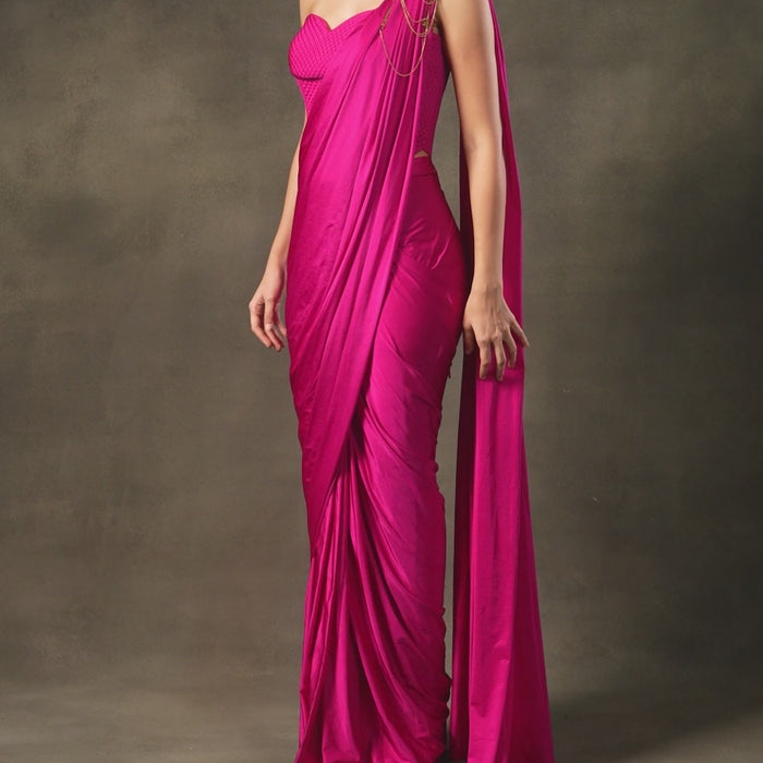 This bright Pink pre-drape saree is crafted in soft satin paired with a sculpted corset blouse featuring detailed panel work & a statement brooch