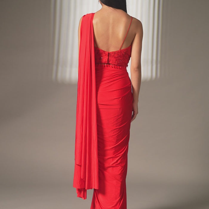 This equisite red pre-draped saree is tailored in fluid fabric for a flattering fall and the blouse is beautifully adorned with hand embroidery and tassels.