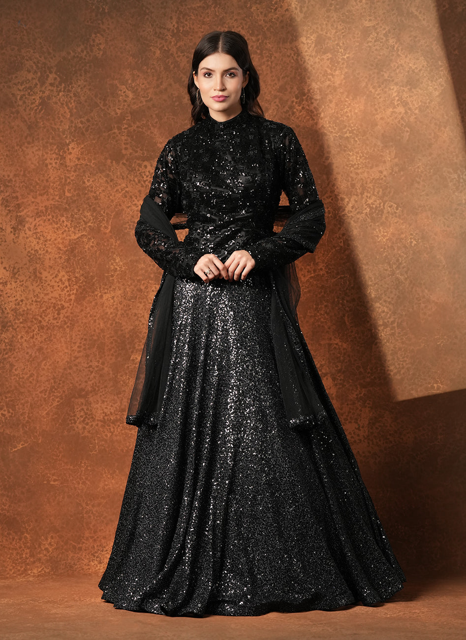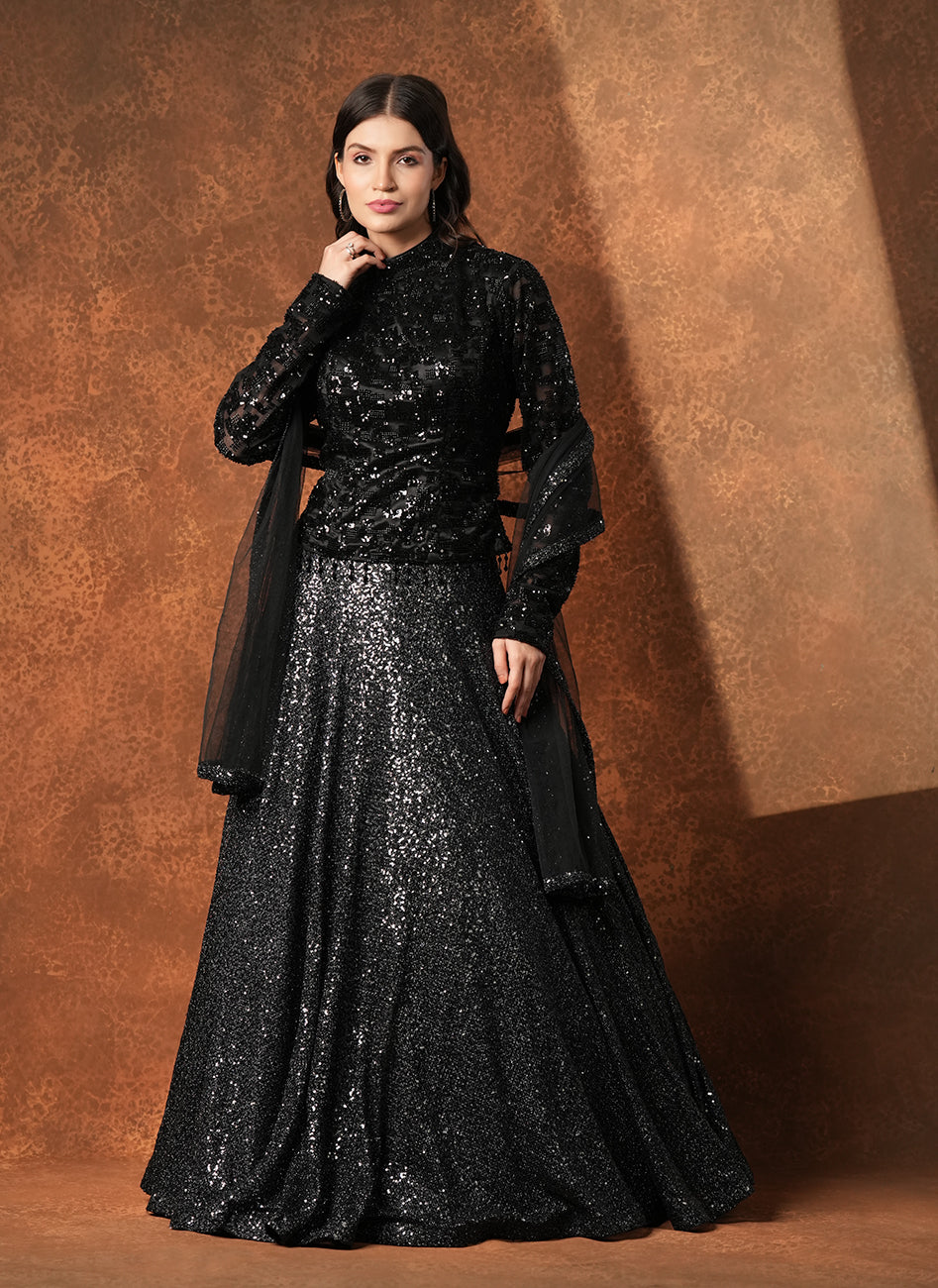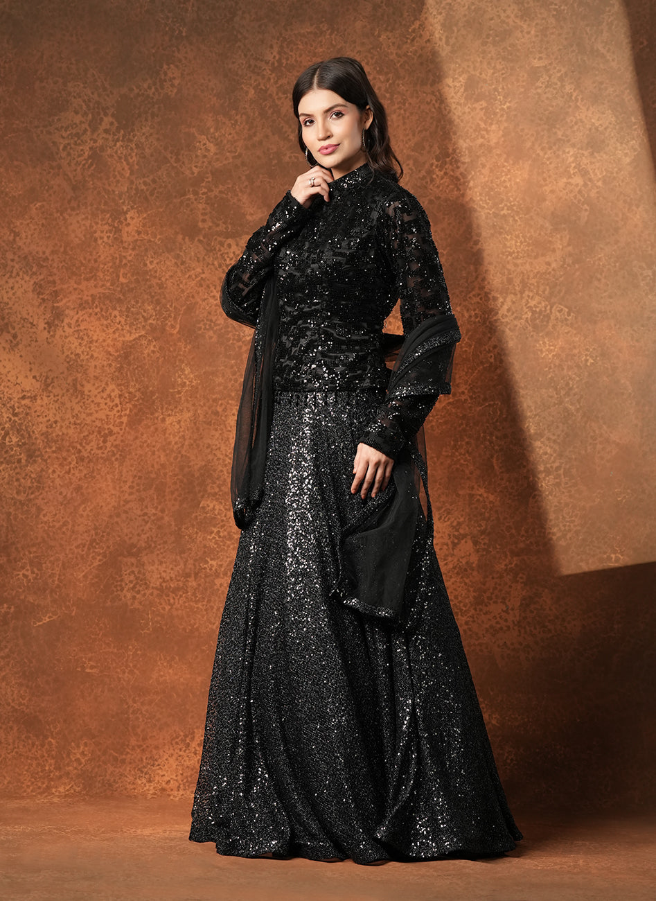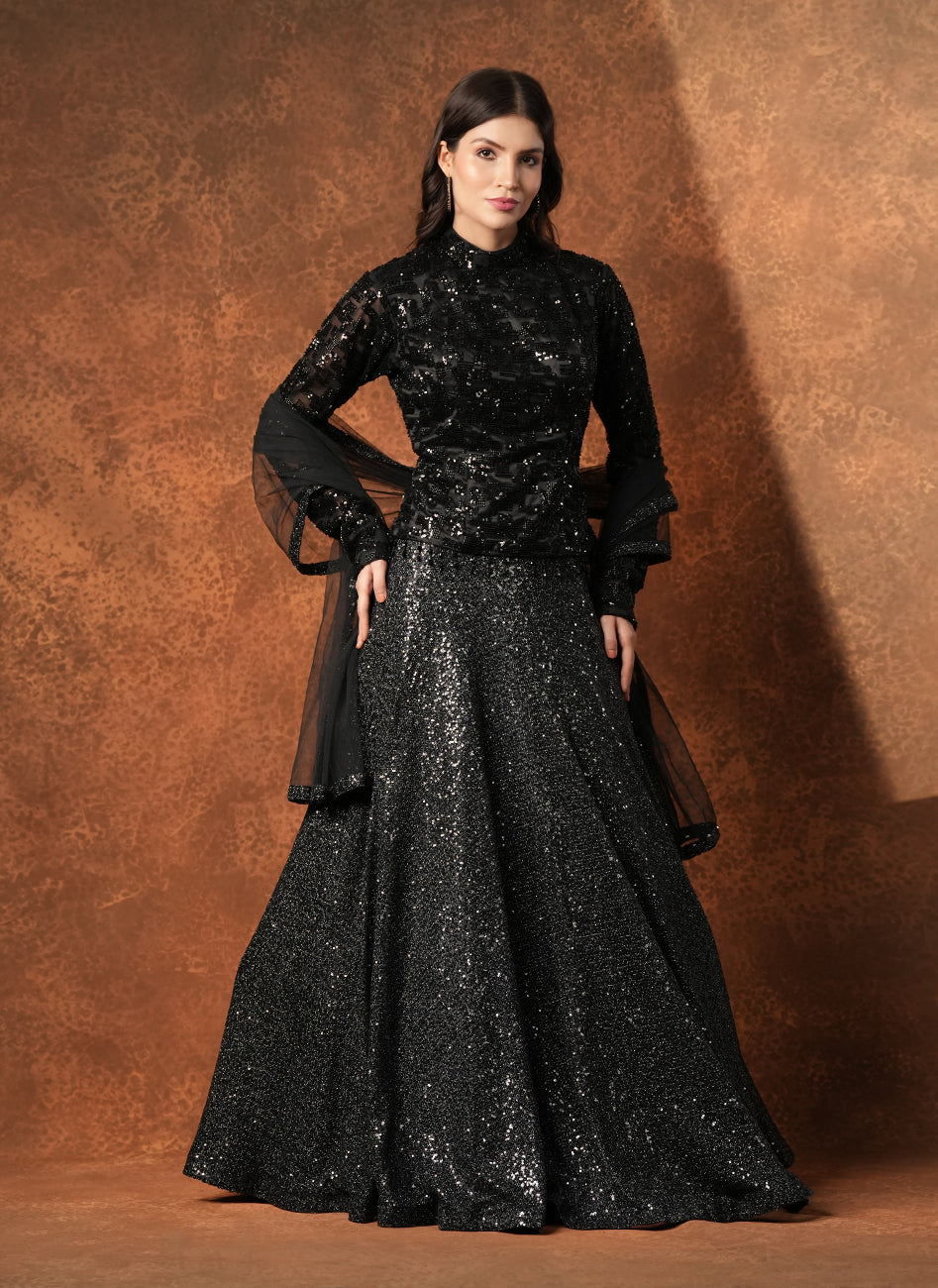 This timeless all black masterpiece features a full sleeved high neck blouse intricately hand embellished with tonal sequins and beadwork, paired with a voluminuous black sequin flowy skirt