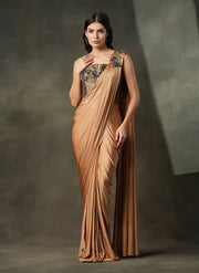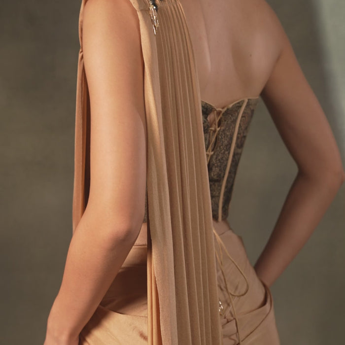 This golden toned pre-draped satin saree is paired with a handcrafted floral embellishment and crystal detailing corset blouse