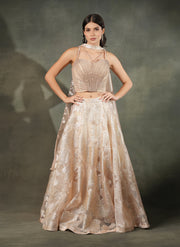 This set features a full flair organza brocade skirt in rich floral woven detailing, a sculpted bustier blouse with linear hand embroidery and stone studded detailing enhanced by structured cuts and modern strap work with an organza shimmer choker dupatta