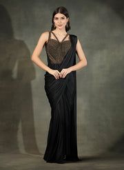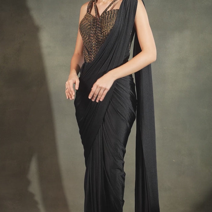 This bold and beautiful black drape set is tailored in rich flowing fabric with a gold corset blouse, strucured with layered cord detailing and multi strap shoulders that add a powerful edge to the look